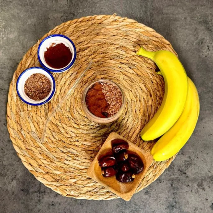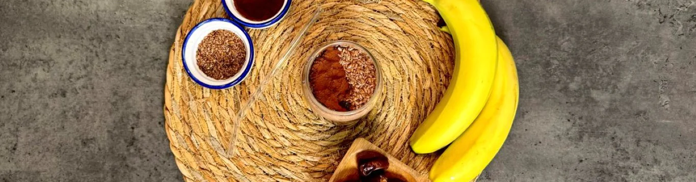 В чашу блендера выложите банан, финик, молотые семена льна и какао-порошок.